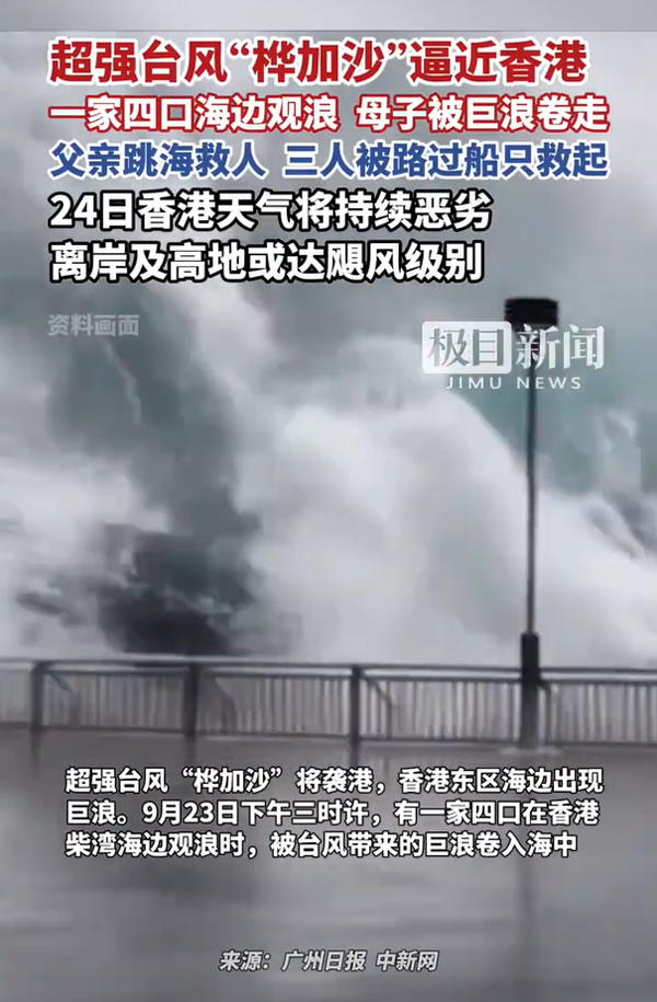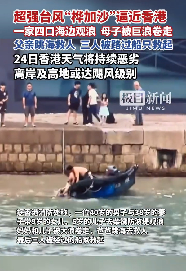 超强台风“桦加沙”来袭,香港海边惊现险情。一家四口海边观浪,母子被巨浪卷走,被巨浪卷走,父亲跳海救人。幸运的是,三人被路过船只及时救起。