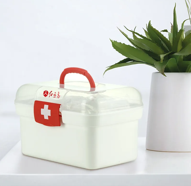 常备急救药箱,包括纱布、碘伏、创可贴等。