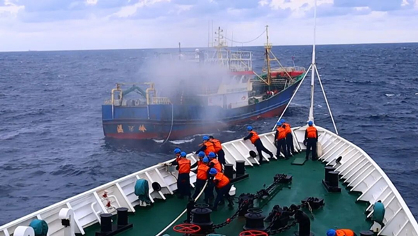 12月16日,中国海警局直属第二局六横舰在辖区海域接到警情:浙岭渔29811号船在海上作业时机舱突发火灾,9名渔民生命安全受到严重威胁。