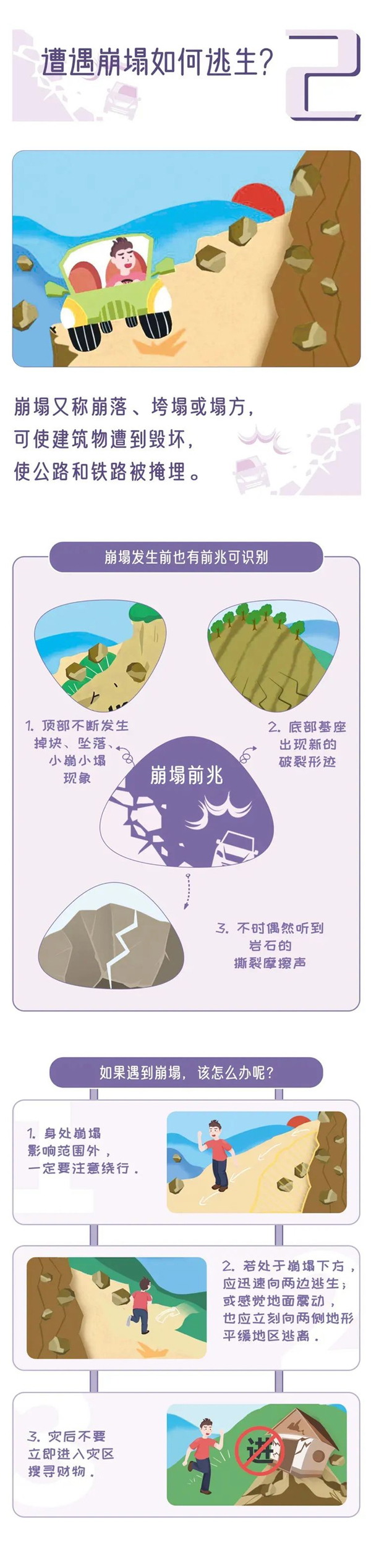 滑坡前兆 :在斜坡上不时有岩石掉落,出现新的裂缝;斜坡上的电线杆、树木、篱笆等突然倾斜;地下传来异常响声,类似石头碰撞、树木折断的声音。